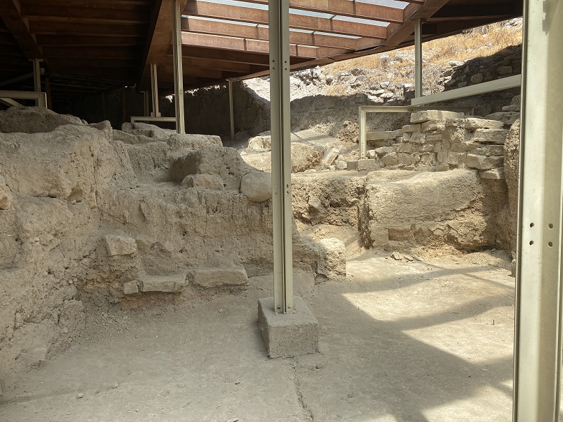ayakları bulunan ahşap bir koruma çatısıyla ile örtülen höyüğe sağlı sollu